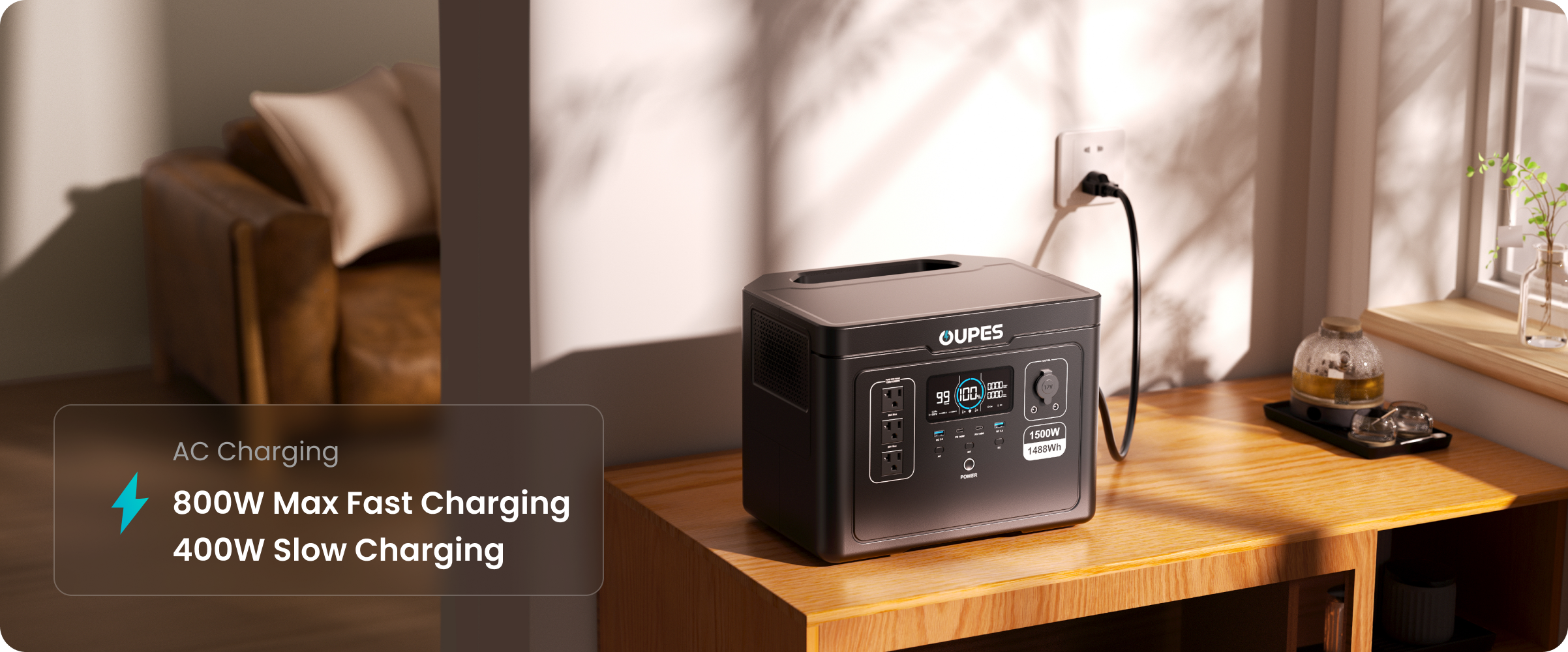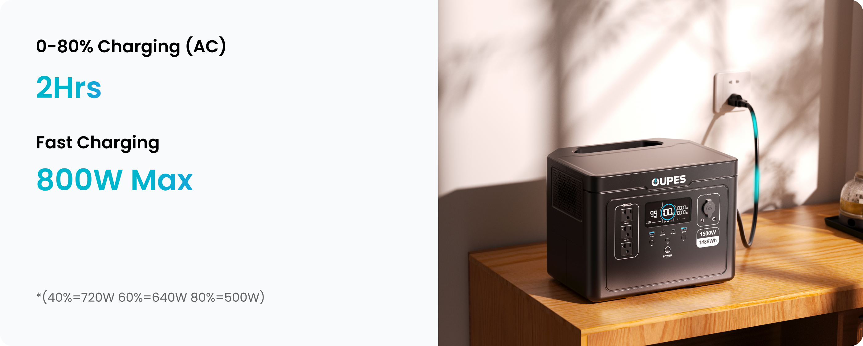 Recharge swiftly with 800W max fast charging—hit 80% capacity in only two hours. Ideal for powering up quickly before your morning routine or an urgent outdoor adventure